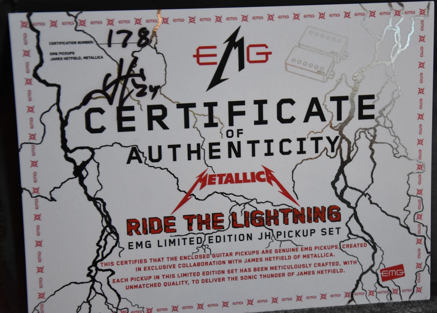 Cerise sur le gâteau , les micros d'origines sont dans le case et la belle est équipée de la version ultra collector des EMG James HETFIELD reliqués par Bill NASH et livrées avec un tee shirt commémoratif et un 2 eme certif pour les micros reliqués signé de la main de James HETFIELD.