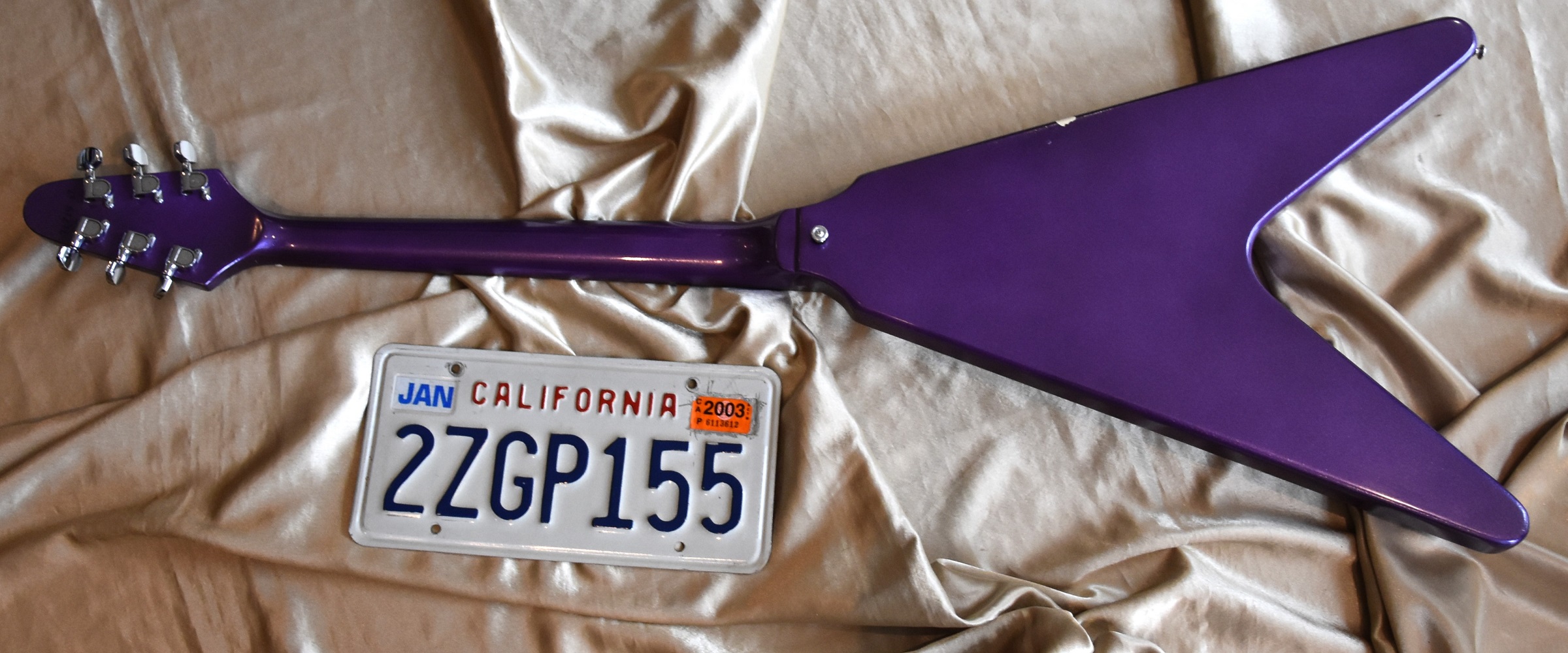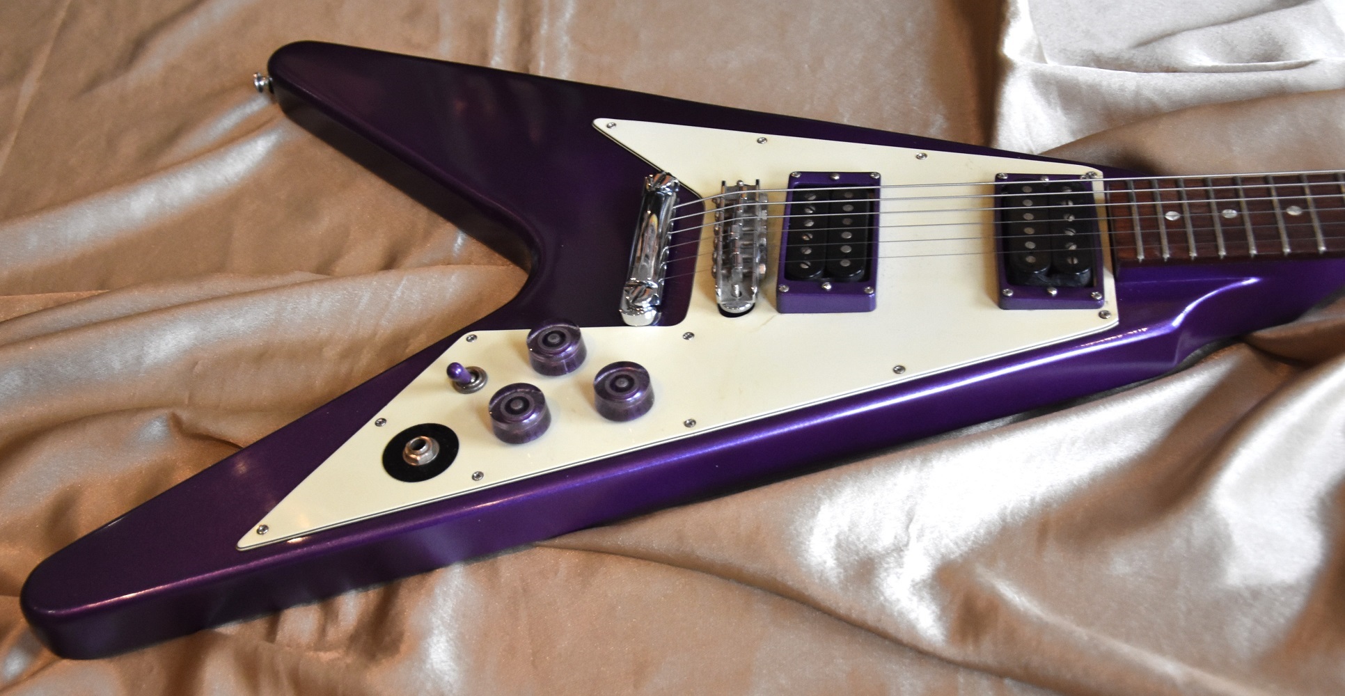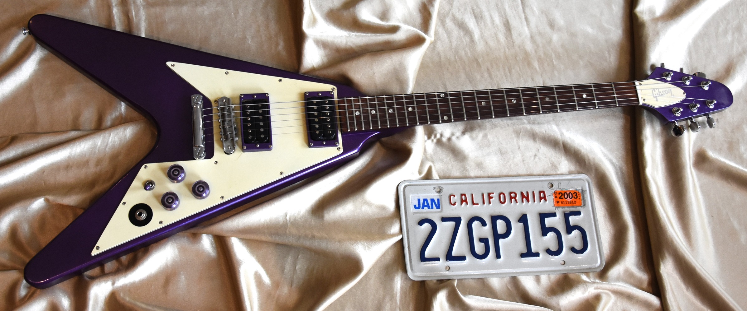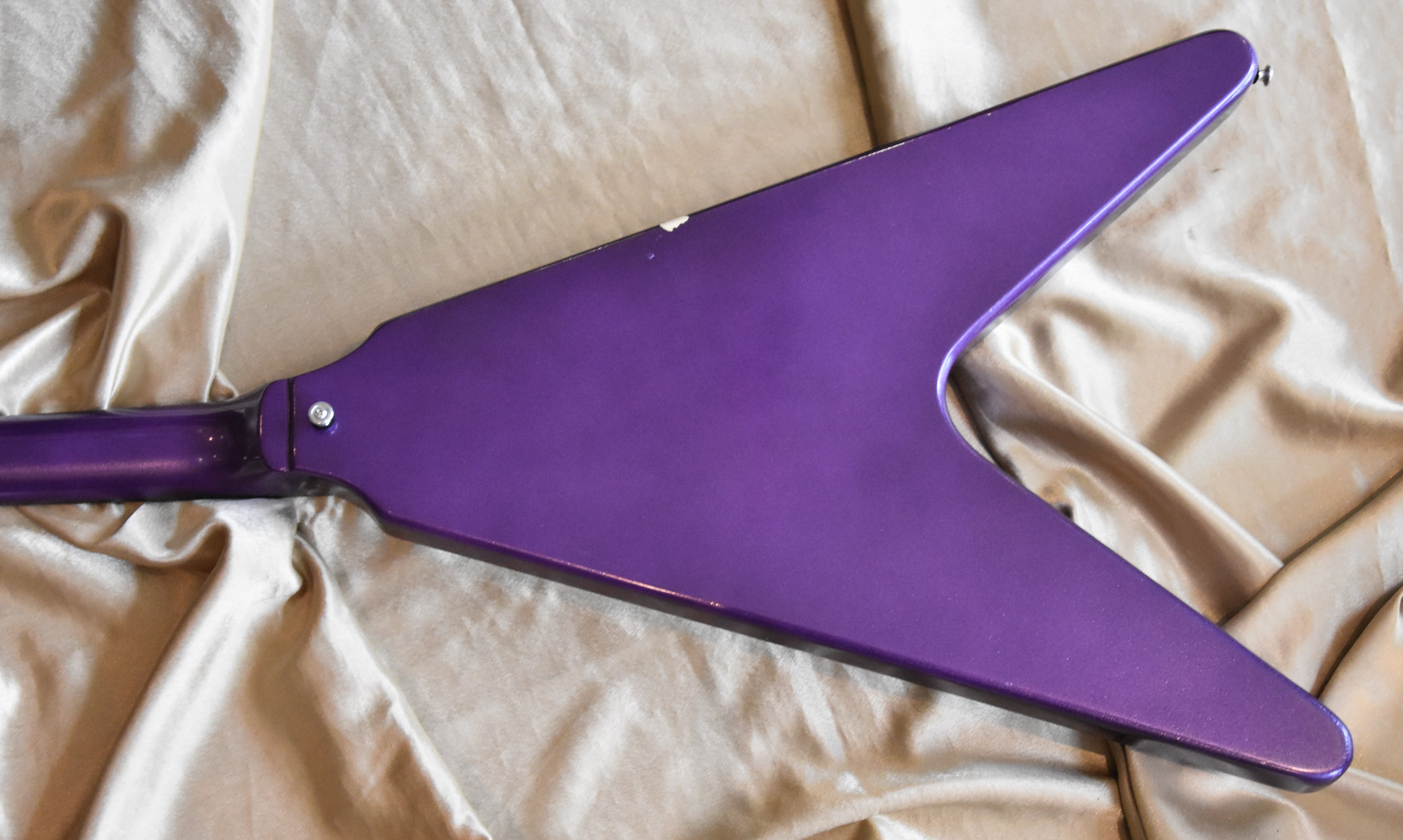 La forme de flying v ne lui convenant pas il l'a revendu au magasin et par pur hasard elle ressemble comme 2 gouttes d'eau au modèle de KIRK HAMMETT seulement produite en purple en série limitée par EPIPHONE.