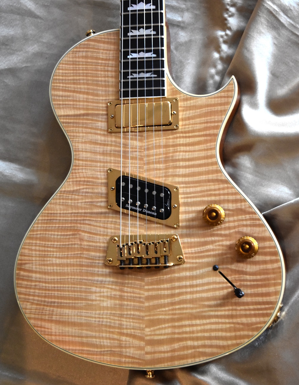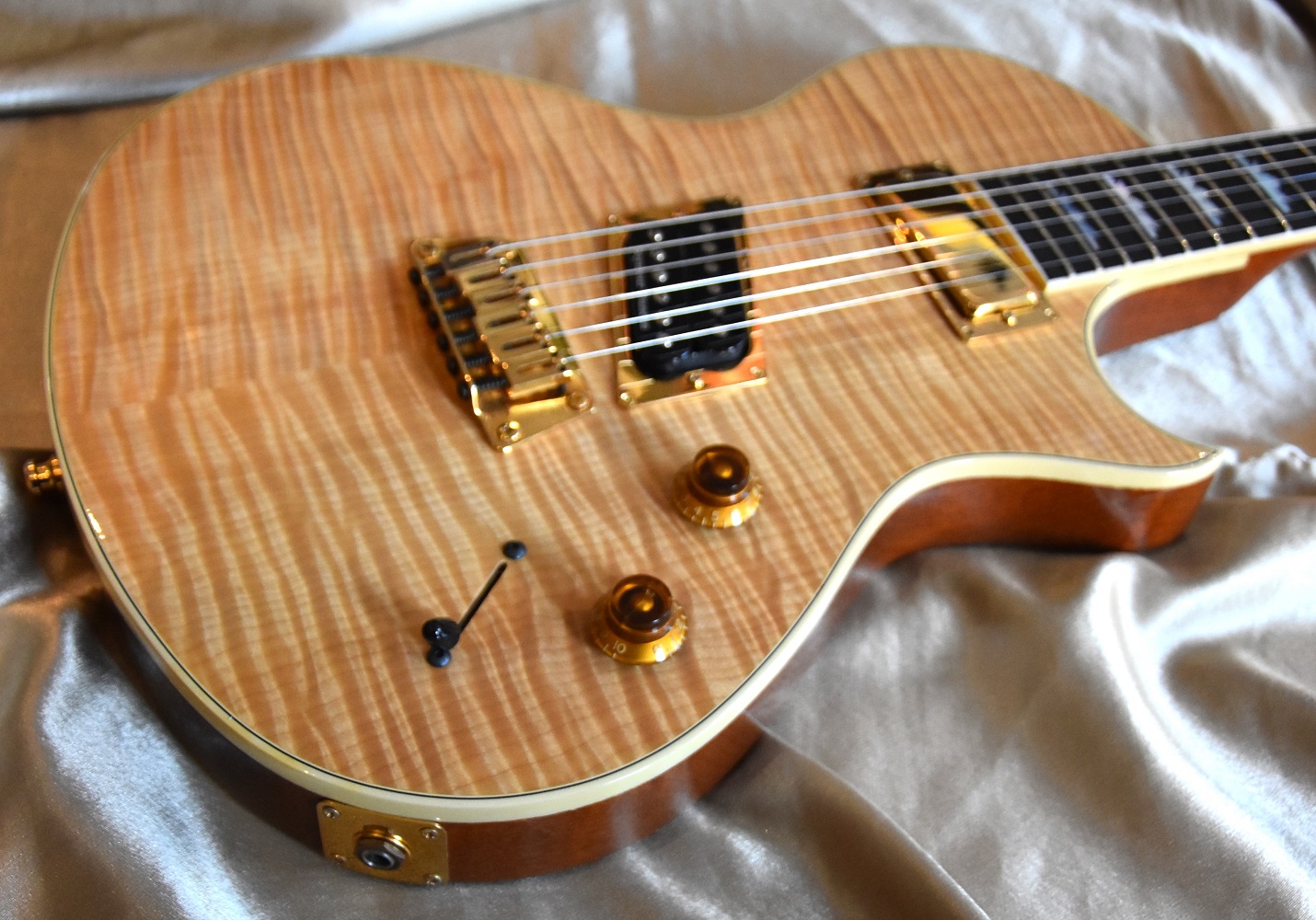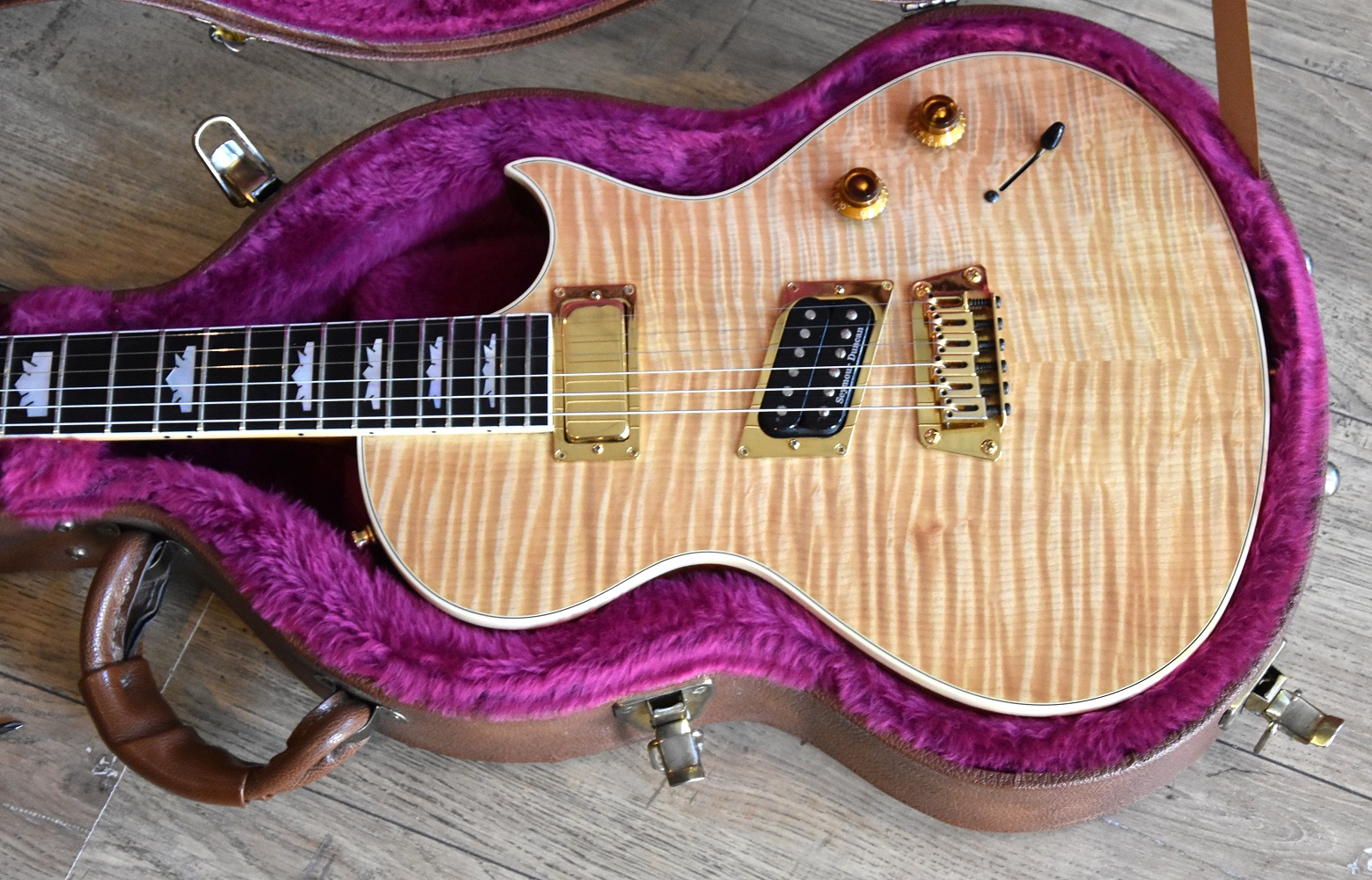 La guitare possède une table flammée AAAA en versiopn natural qui est sublime .
