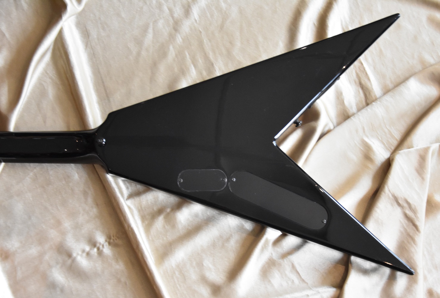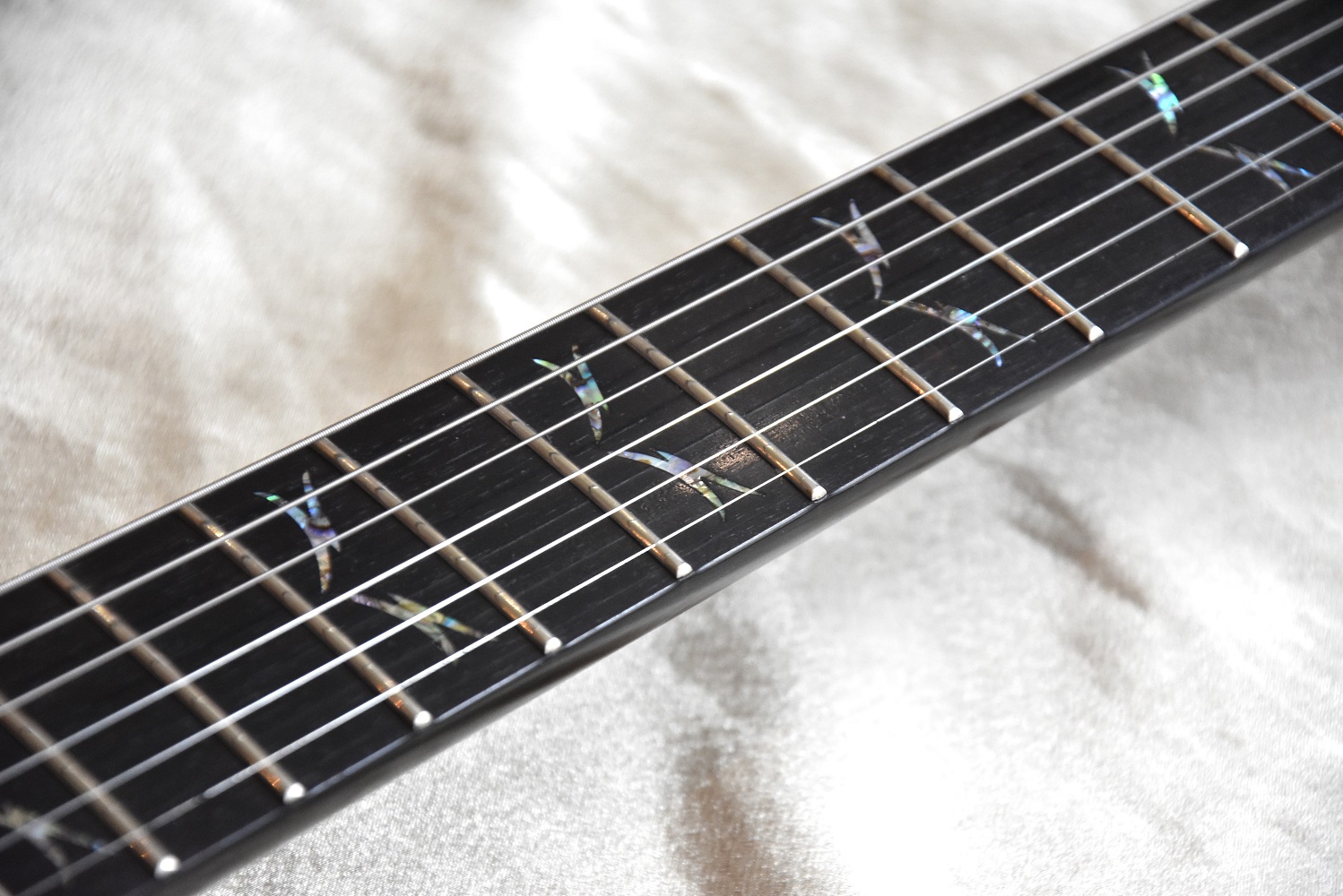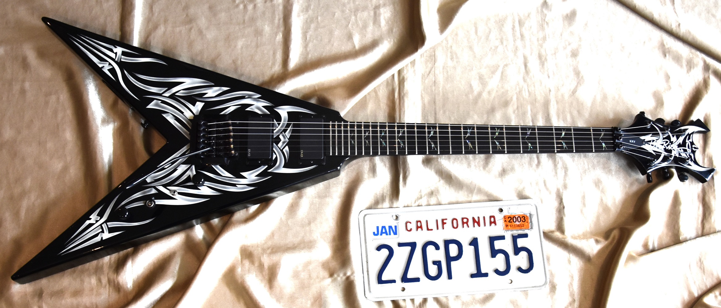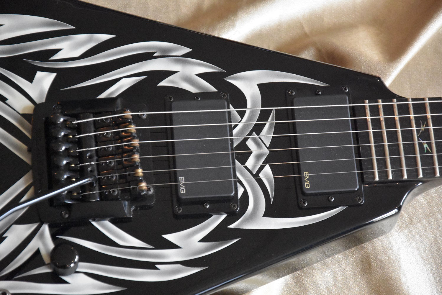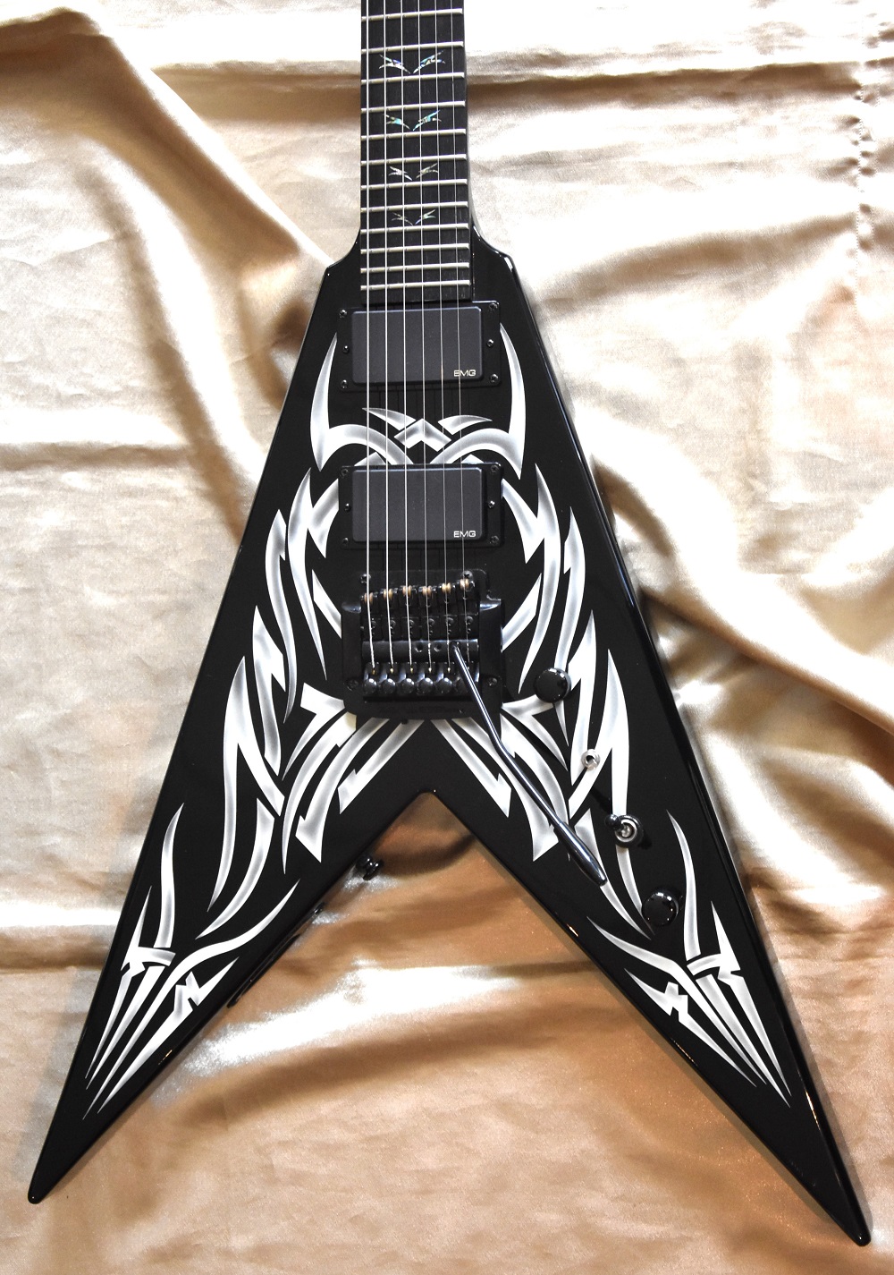 C'est la Black and White Tribal Flying en version manche conducteur avec touche en ébène et repère en abalones sur tout le manche .