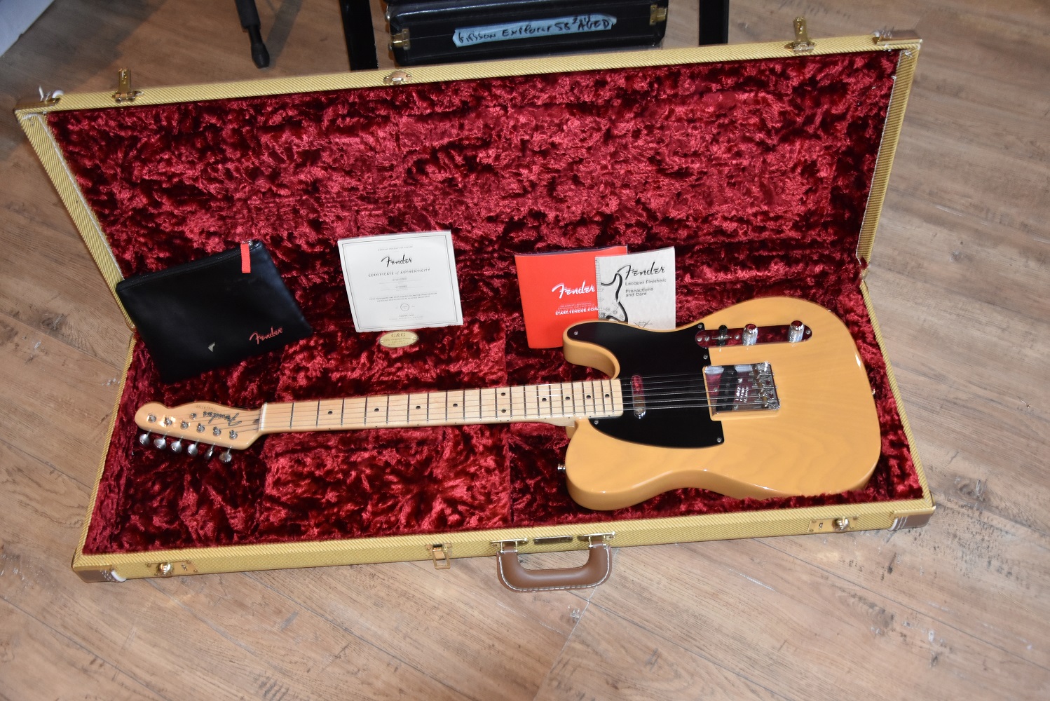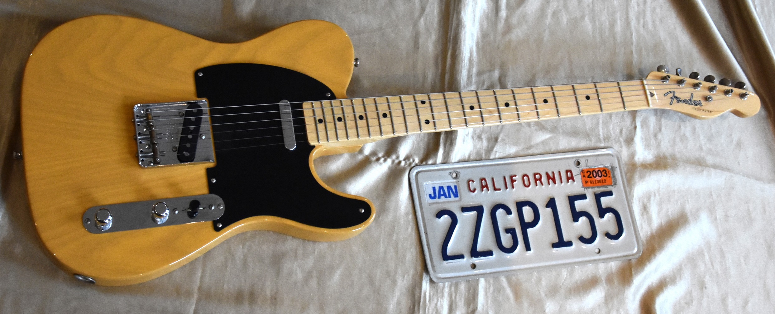 Cette joie FENDER TELECASTER fait partie de la série AMERICAN VINTAGE , c'est une reissue 1952 en finition butter scotch .