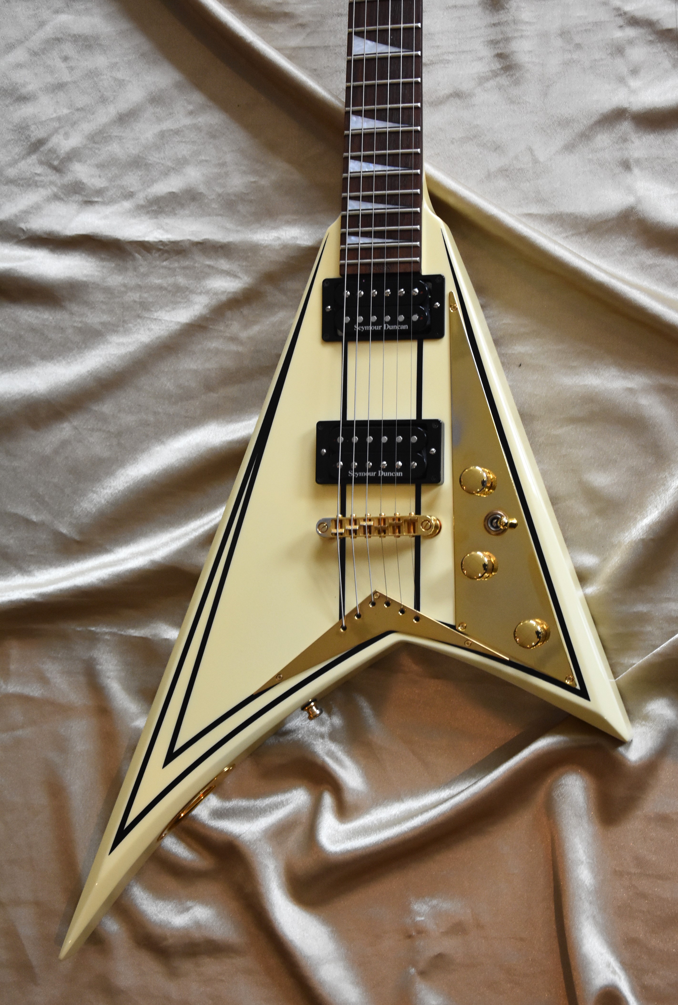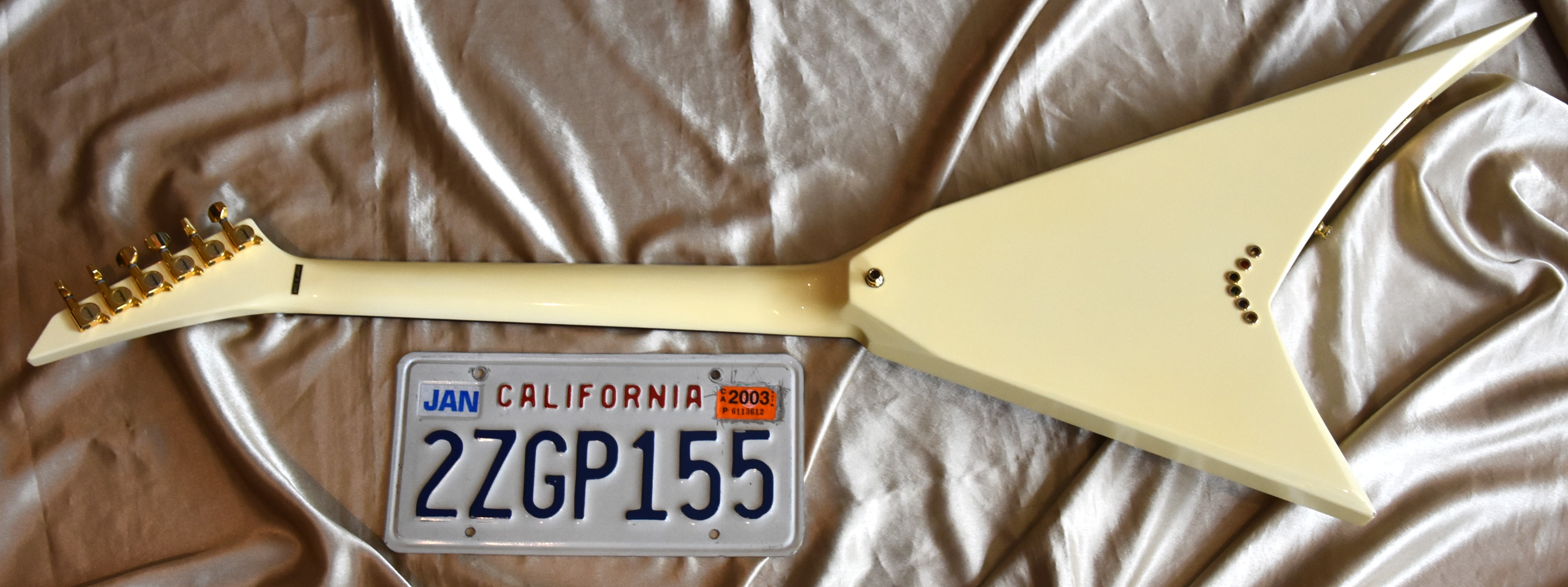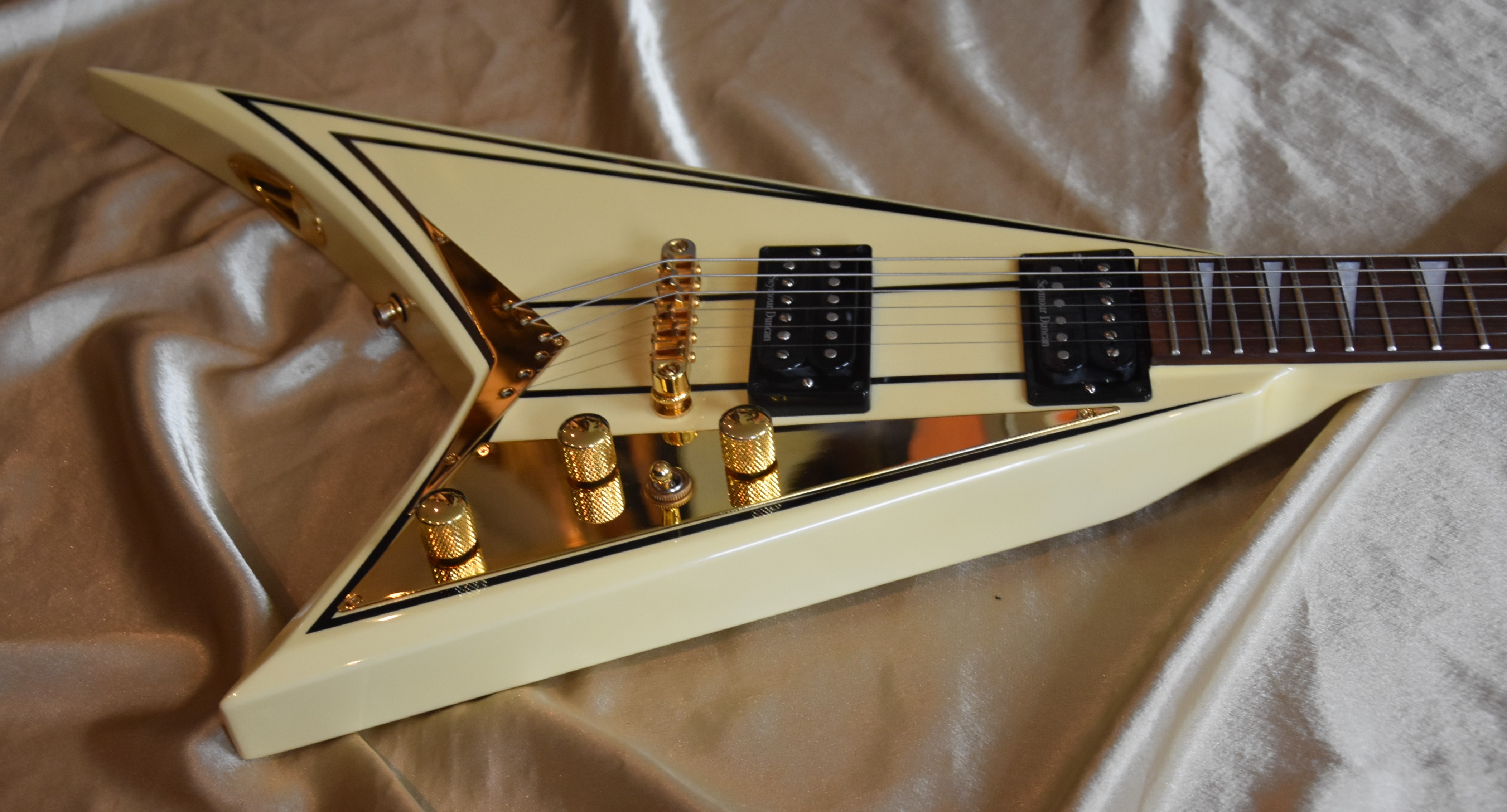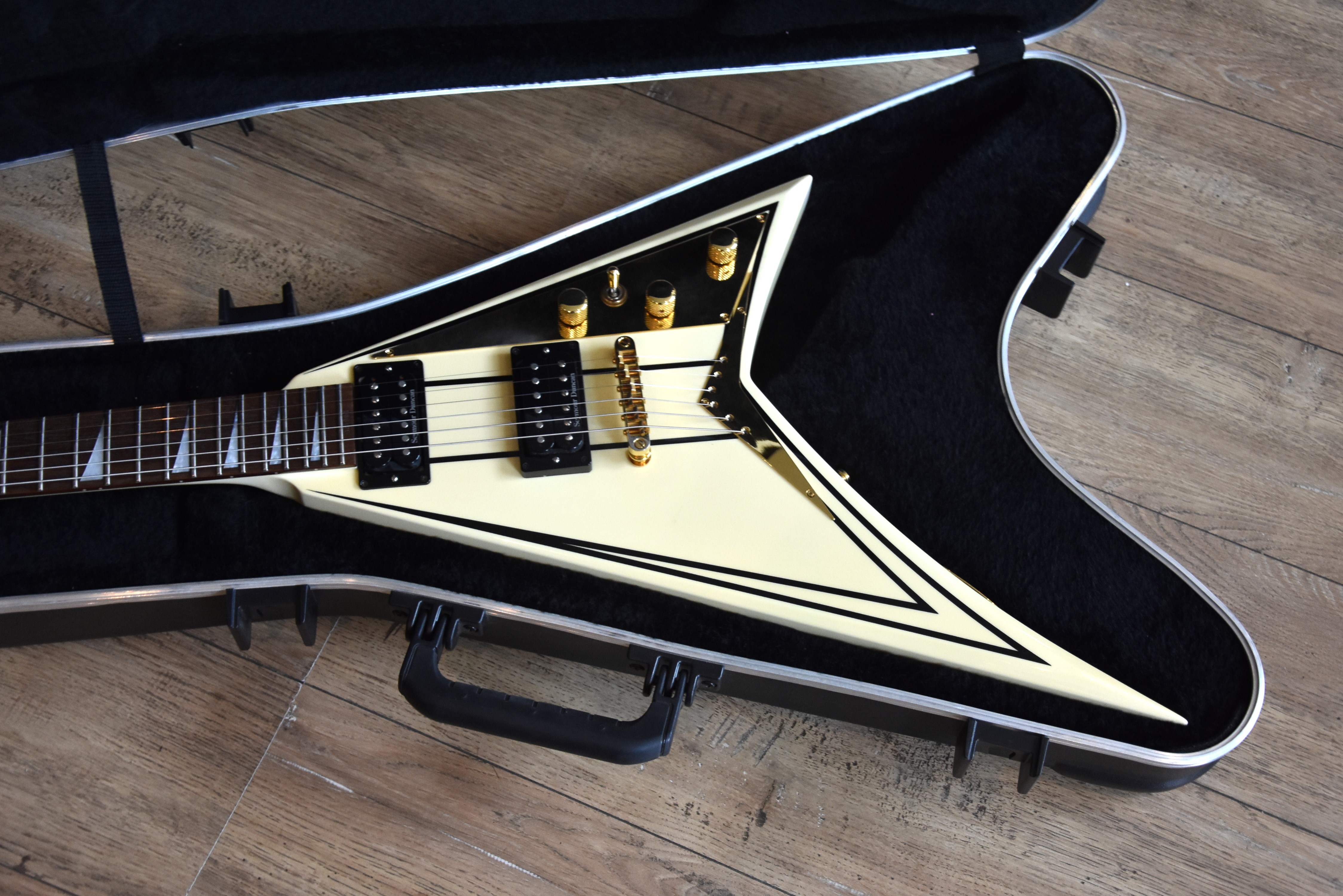 C'est la finition de La Randy Rhoads originale coloris crème , manche traversant black stripes et cordes traversantes a la manière d'une Flying v 58 .
