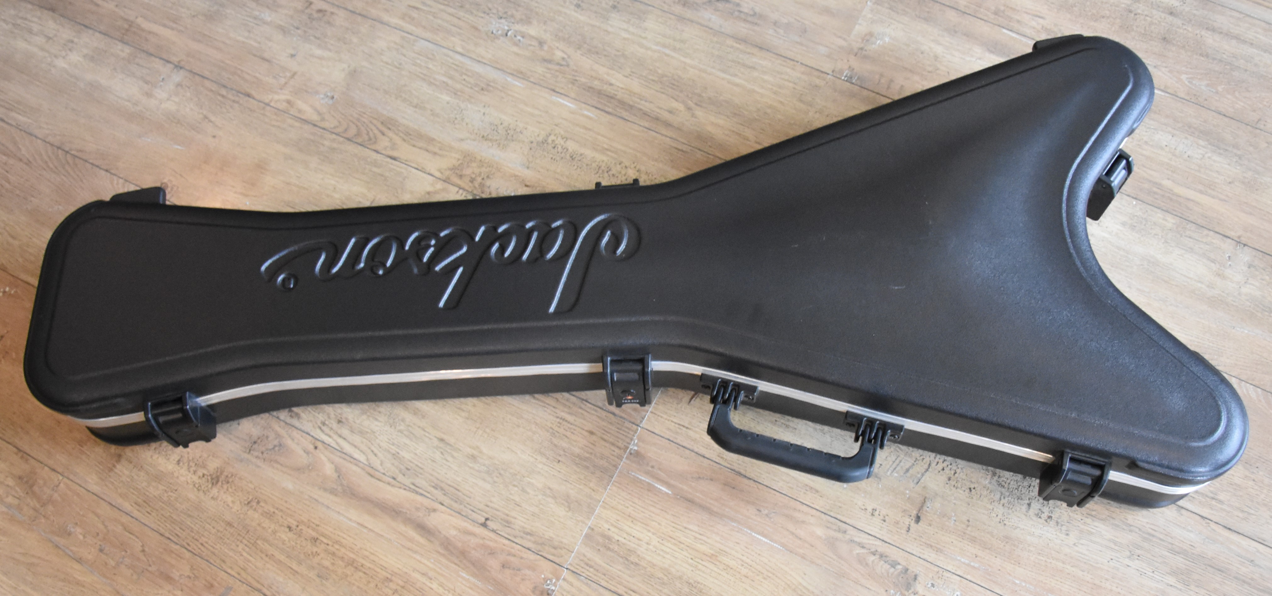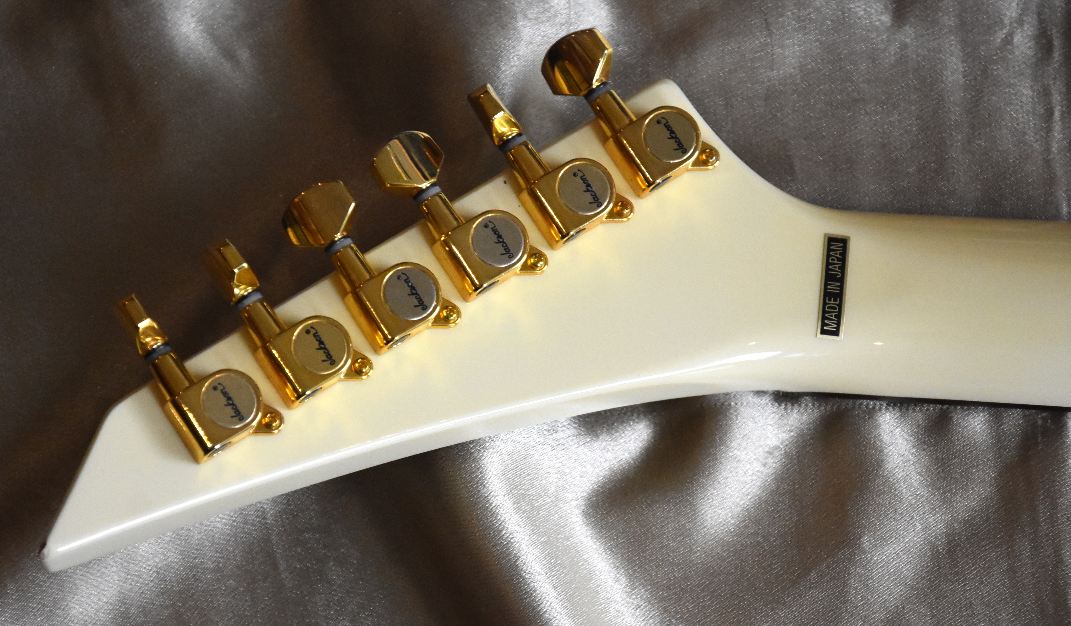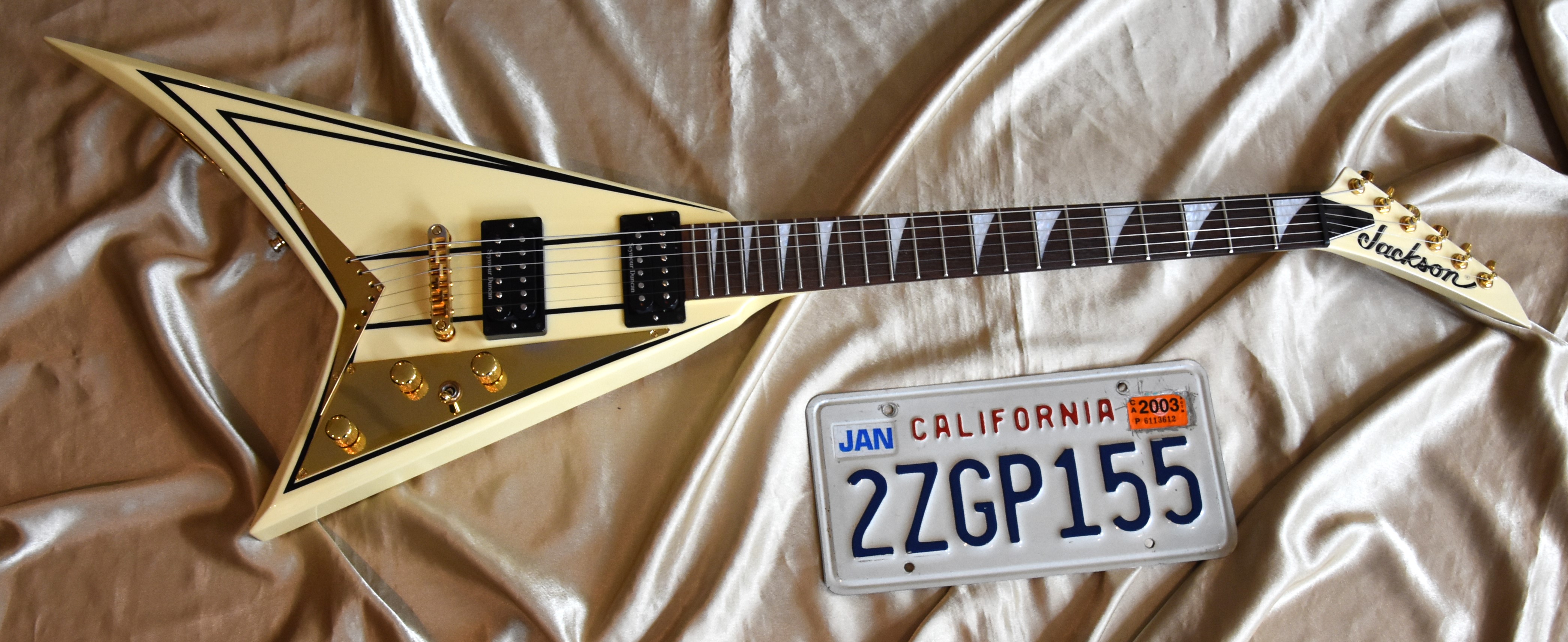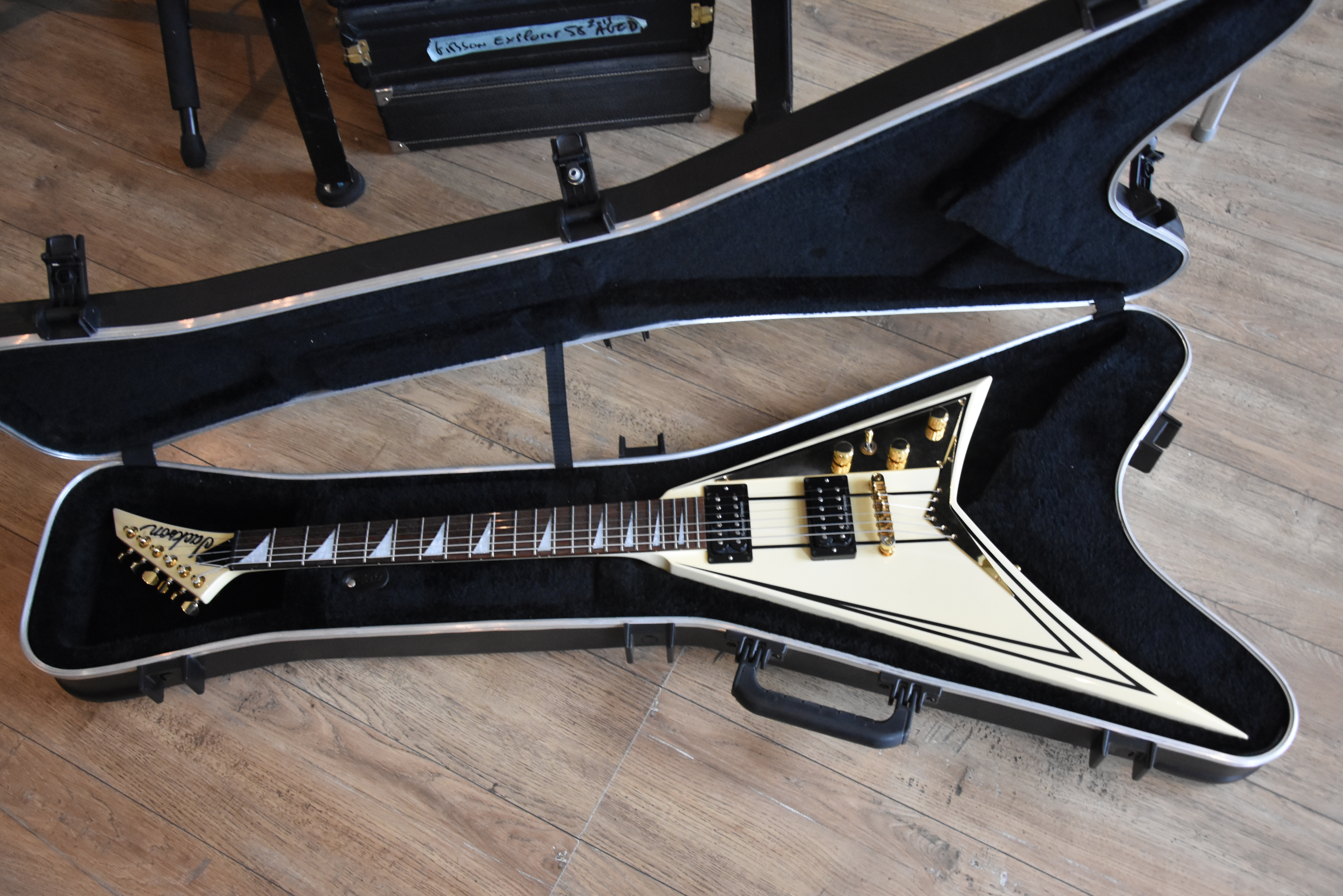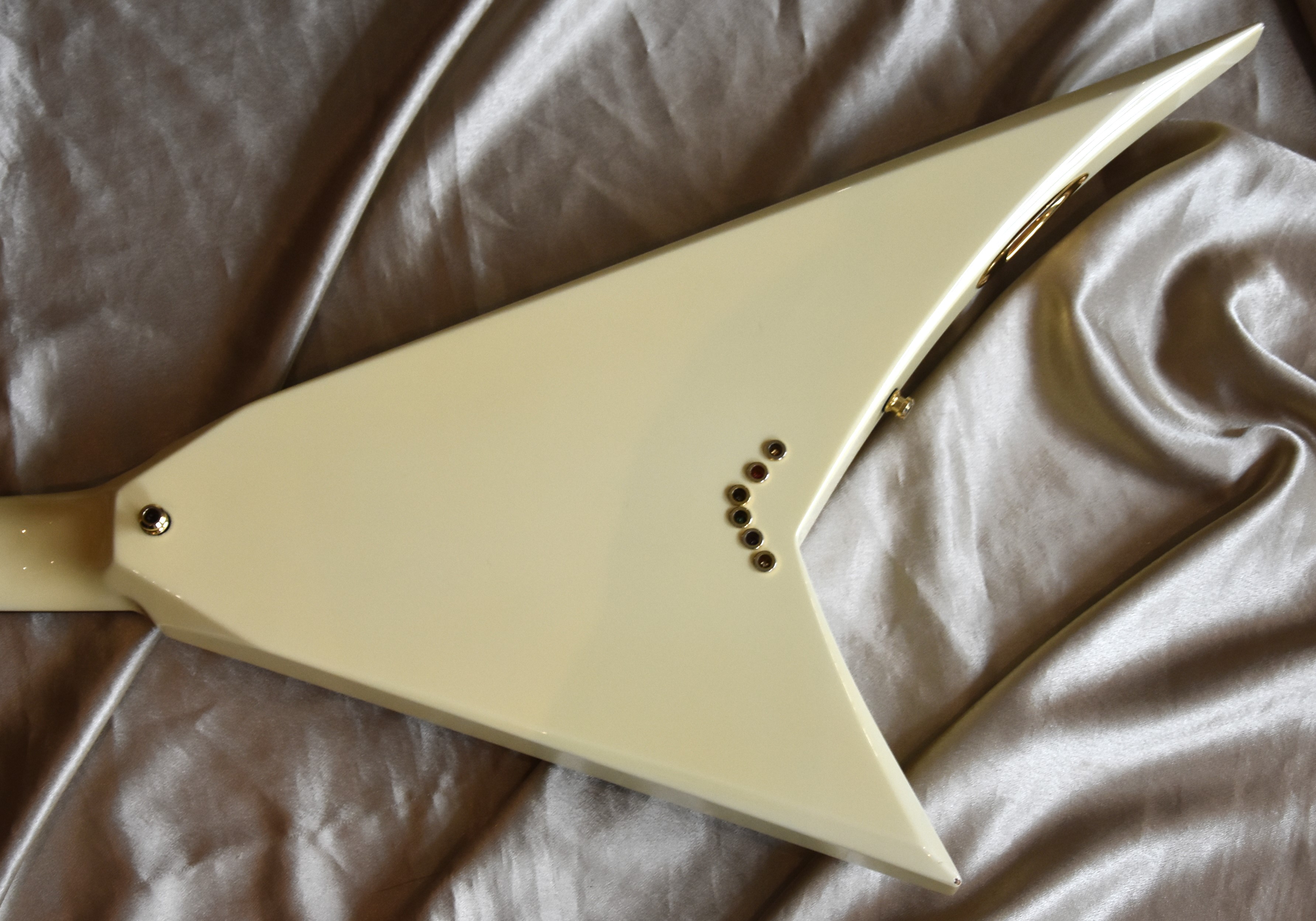 C'est la finition de La Randy Rhoads originale coloris crème , manche traversant black stripes et cordes traversantes a la manière d'une Flying v 58 .