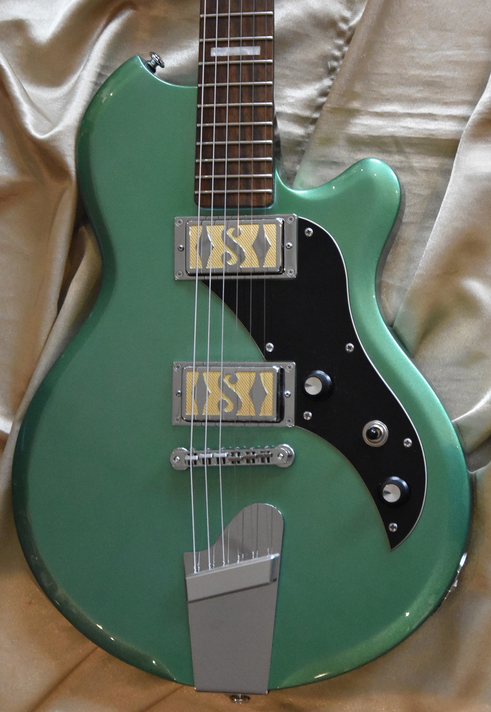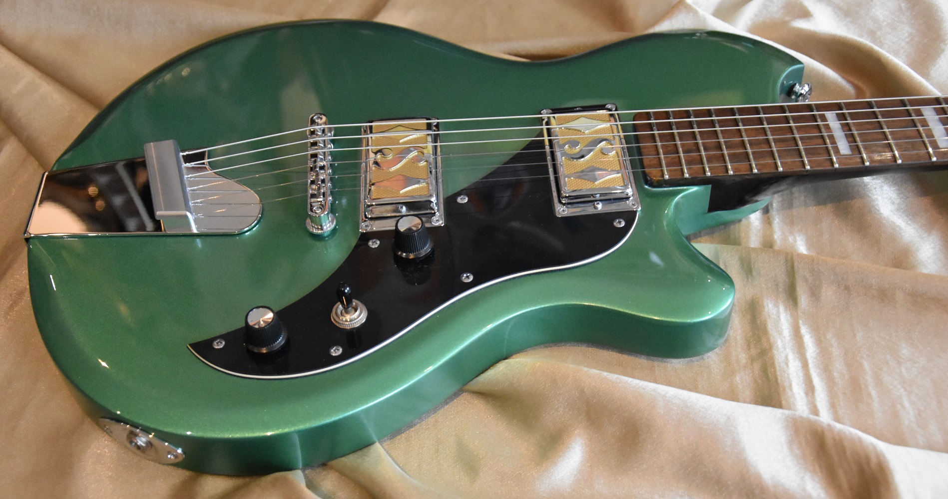 Guitare electrique Supro Modèle 2020BM Westbury Finition green Metallic Corps Aulne Chevalet Tune O Matic Manche Coll rable Vernis satin au dos du manche Touche Pau Ferro Radius 12" Repres de touche Block Acrylic Inlays Diapason 25.5" Micros 2 x vintage Gold Foil Contrles : Master Volume / Master Tone, slecteur 3 positions Cordier